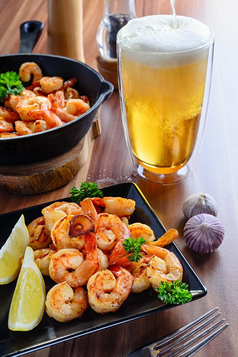 a glass of golden beer with tasty grilled shrimps on wooden table